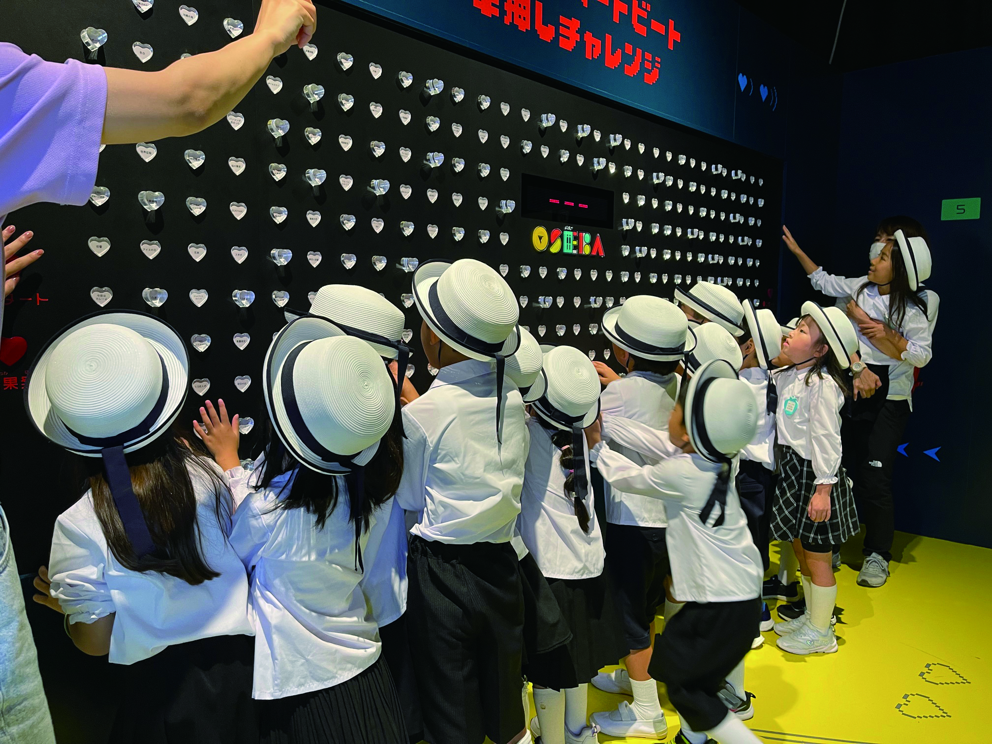 次は「あそぶ」エリアです。ハート型のボタンがずらりと並んでいる「333ハートビート」では、30秒間でいくつ押せるか挑戦できます。ボタンは押すとピンク色に光り、厚みも違うため、大人も夢中の面白さです。333個にした理由は、会社のスローガンが「ハートビート(心動かす)ファクトリー(会社)」であるため、ハートを横向きにした「3」を3つ並べたんだって。