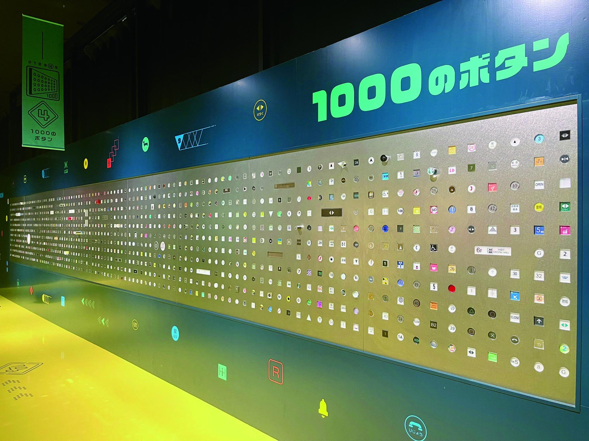 次は、いろんなボタンが壁一面に展示されている「1000のボタン」へ。実際は1048個あり、7割は実際に使用されているもの、残りは一般の人の応募から選んだオリジナルだそう。2つを同時に押さないと光らないボタンや、「人生リセット」ボタン、マヨネーズのキャップ形など個性的なものばかり。「押してはいけない」ボタンを押したら……何が起こるかは来てのお楽しみ。すべてのボタンを押すと、ボタンが電灯のように浮かび、夕暮れの街並みを眺めているよう。最後に休憩スペースに戻って終了です。