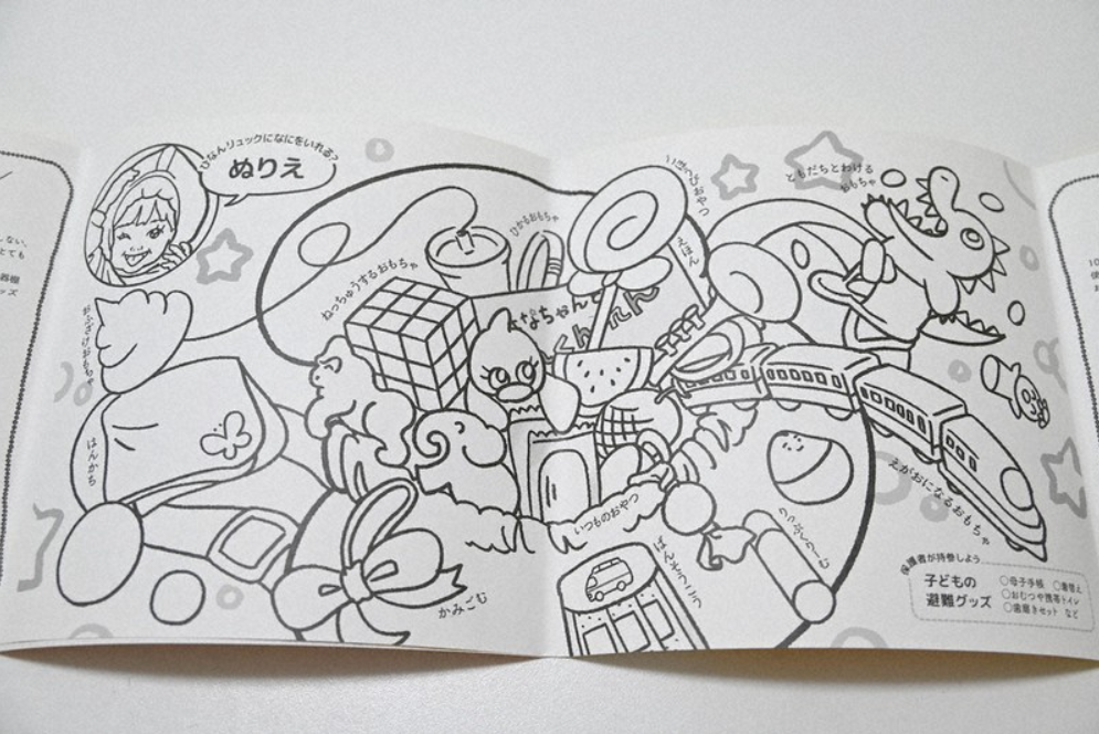 絵本のカバーの裏は子どものための避難グッズがたくさん載った塗り絵になっています。=福島市で